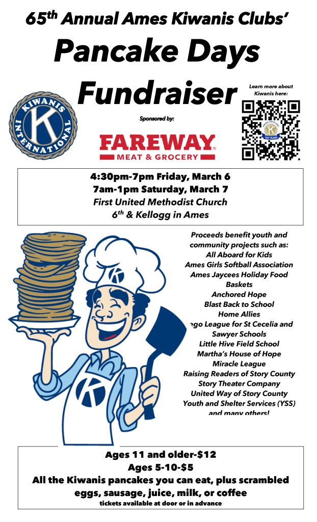 65th Annual Ames Kiwanis Clubs’ Pancake Days Fundraiser + Add to Google Calendar + iCal / Outlook export Date Mar 07, 2026 Time 7:00 am - 1:00 pm Event Type AREA Business Calendar Share this event
